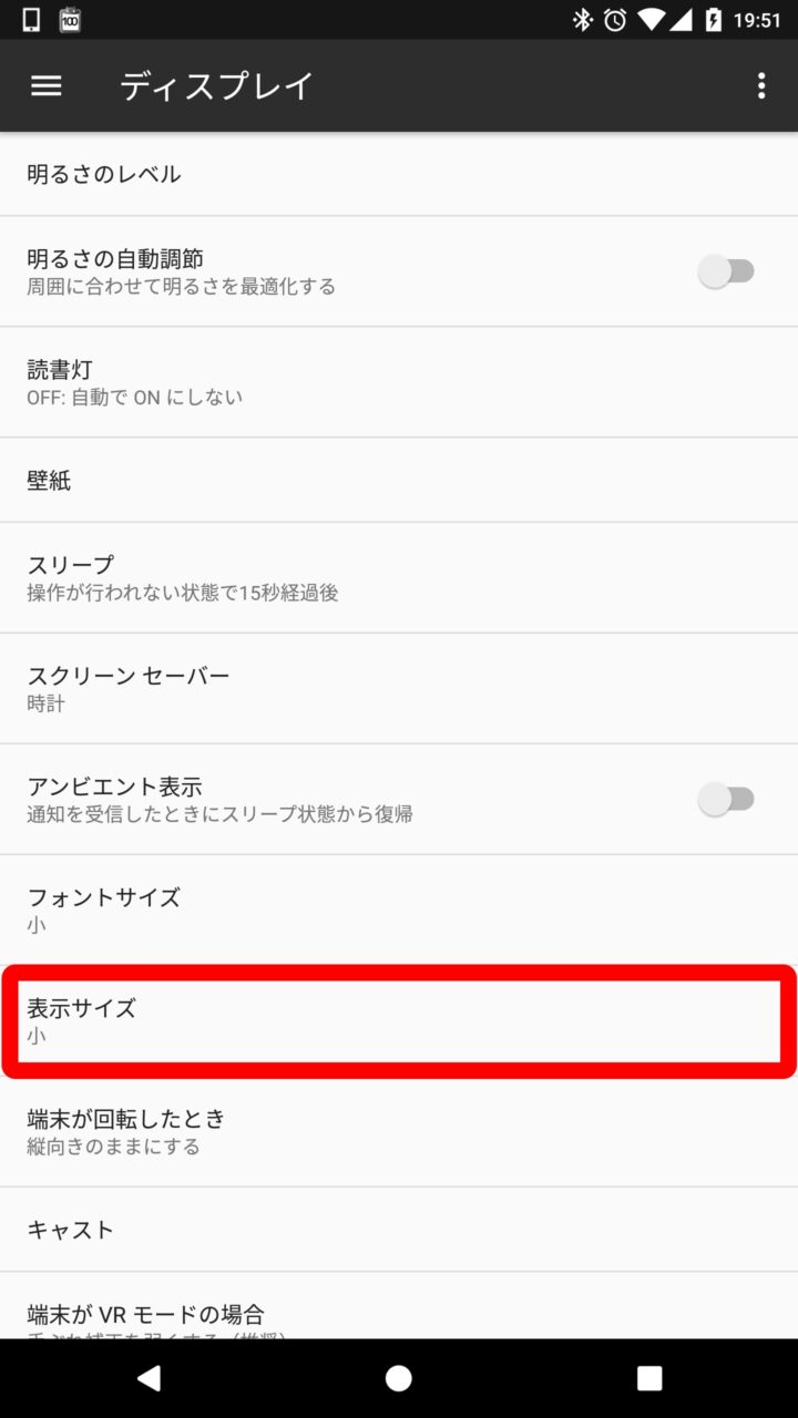 Android の “表示サイズ” の変更項目は、Android の設定から “ディスプレイ” をタッチすることで表示されます。
