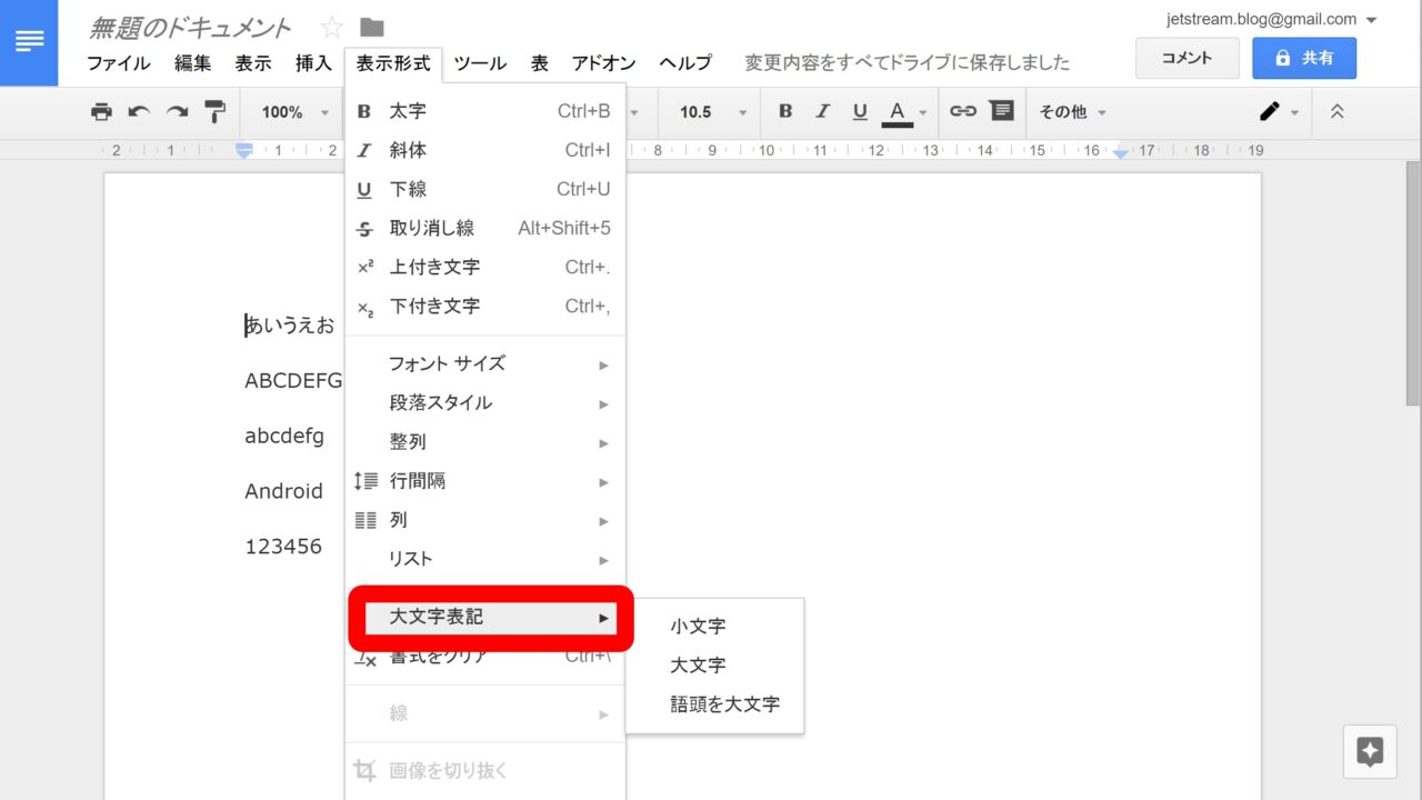 デスクトップ版「Google ドキュメント」は 2017 年 3 月末にアップデートされ、アルファベットの大文字と小文字の表記変換機能 “大文字表記” が追加されました。この機能を利用することで、アルファベットの表記を一括で変換することができます。