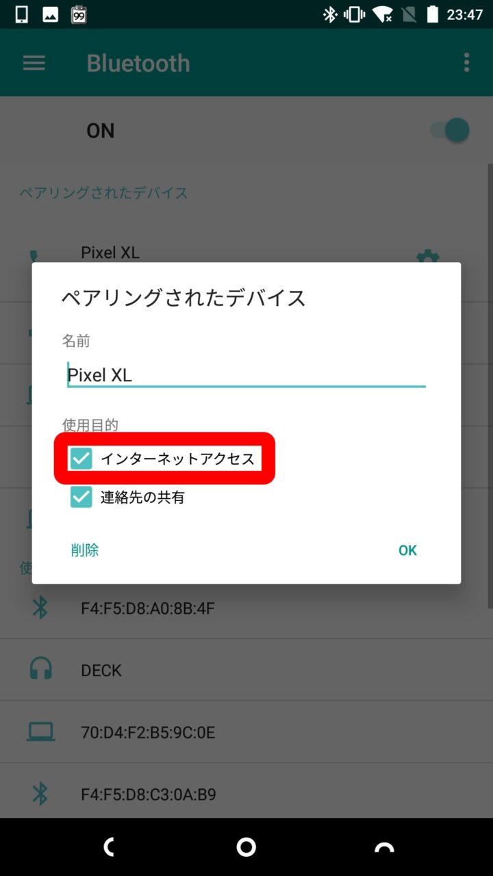 ここまで設定したら “Bluetooth テザリング” の準備は完了です。あとはクライアント側の Android の Bluetooth 設定からホストとする Android の機種名の右側に表示される設定アイコンをタッチして、表示される “ペアリングされたデバイス” ウィンドウの “インターネットアクセス” にチェックを入れます。