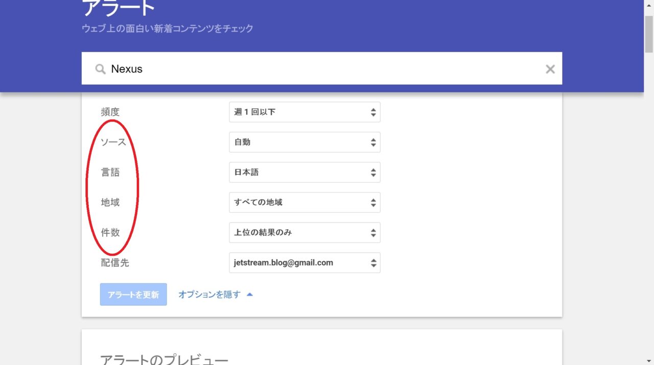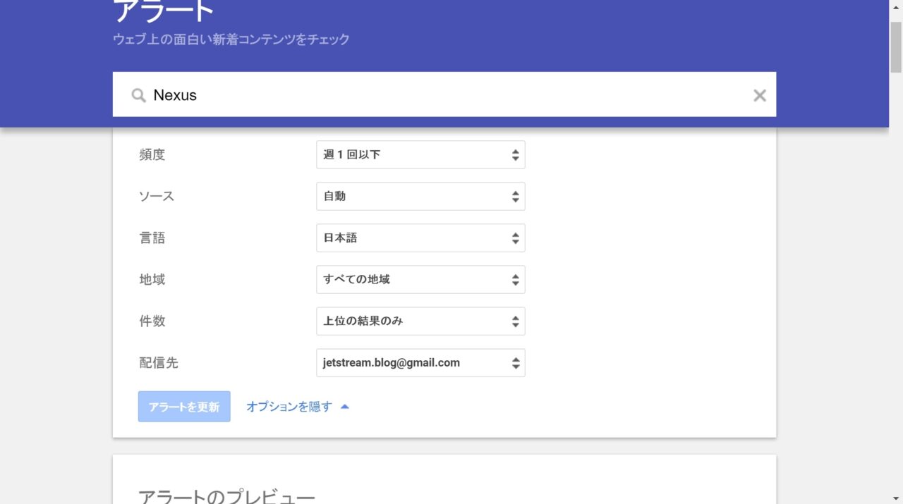 エゴサーチ用に「Google アラート」を使用しないのであれば、“上位の検索のみ” の設定のままで良いでしょう。