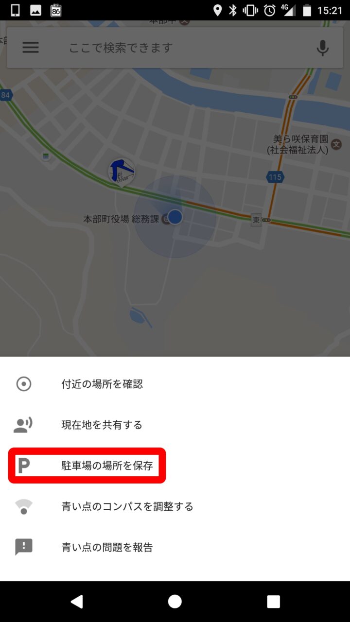 そして出てくるメニューから “駐車場の場所を保存” をタッチします。