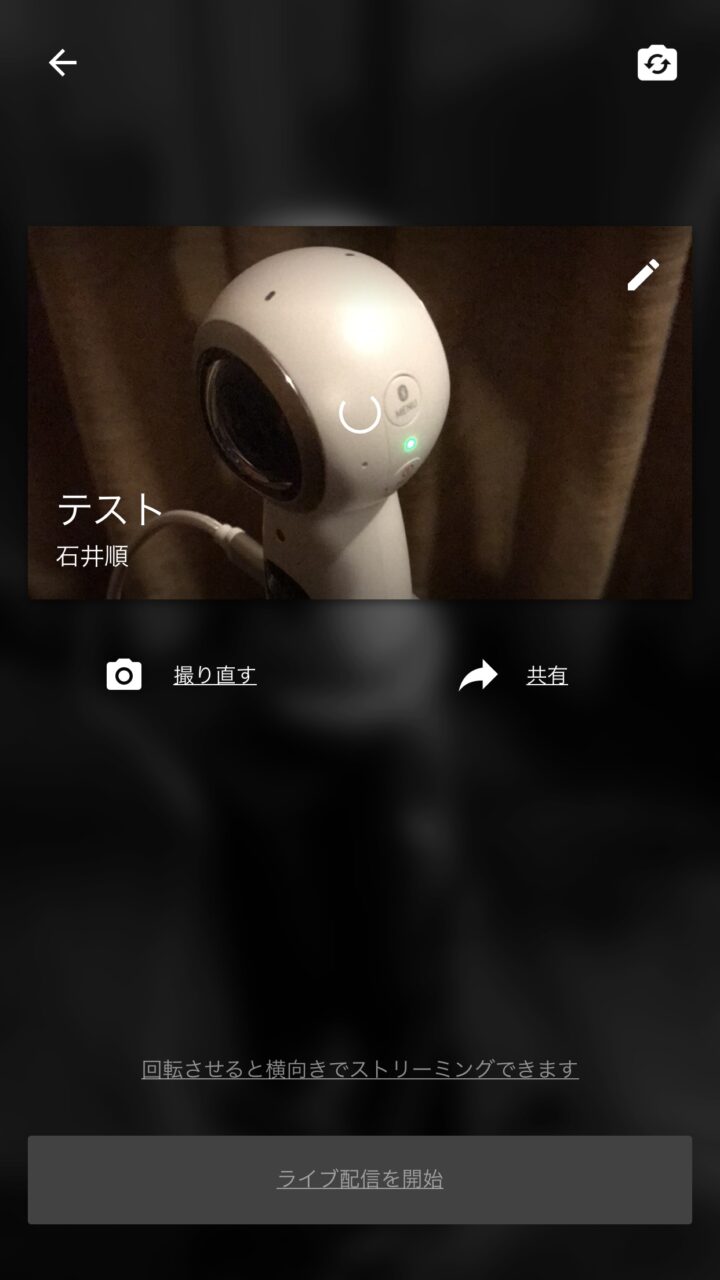 この画面では共有アイコンをタッチすることで SNS などに “ライブ配信” のお知らせを投稿することもできます。そしてサムネイルを設定して “ライブ配信を開始” をタッチすることで “ライブ配信” が開始されます。