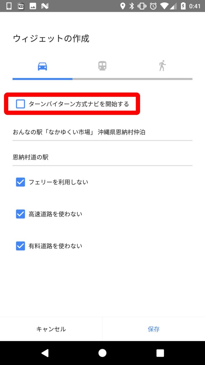 このほか “ターンバイターン方式ナビを開始する” にチェックを入れておくと、ウィジェットをタッチしたときにナビゲーションがダイレクトに開始されます。このチェックを外しておくと、ウィジェットをタッチしたときにナビゲーションを開始する手前の画面が表示され、経路の候補から選んでナビゲーションを開始することができます。