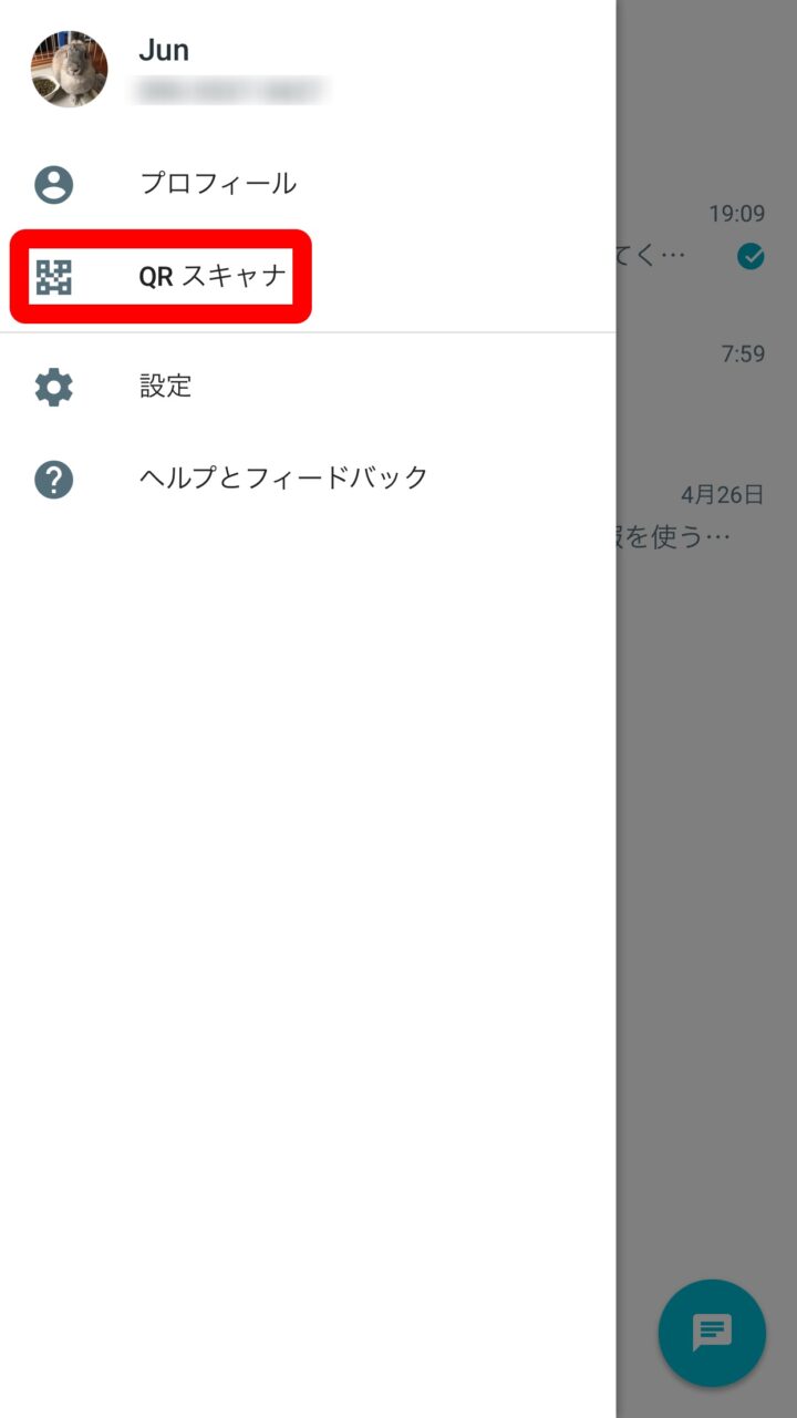 QR コードの読み取りは「Google Allo」のメニューアイコンをタッチして “QR スキャナ” をタッチすることで QR コード読み取り用のカメラが起動し行うことができます。