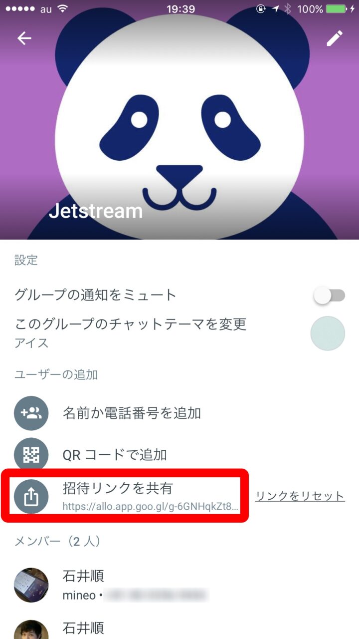 iPhone の場合は “グループの詳細” ページに “招待リンクを共有” があるのでそこをタッチして招待するユーザー宛に URL リンクを送信します。