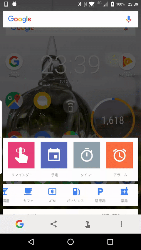 そして「Now On Tap」の一発でスポット検索を行うショートカット機能を主に利用できるのは、Android のホーム画面やドロワー画面においてです。この時にホームボタンを長押しすることで「Now On Tap」が起動され、リマインダーや予定などを作成する各ショートカットが表示されます。このバーを上にスワイプすることでスポット表示を行うためのカテゴリバーが表示されます。