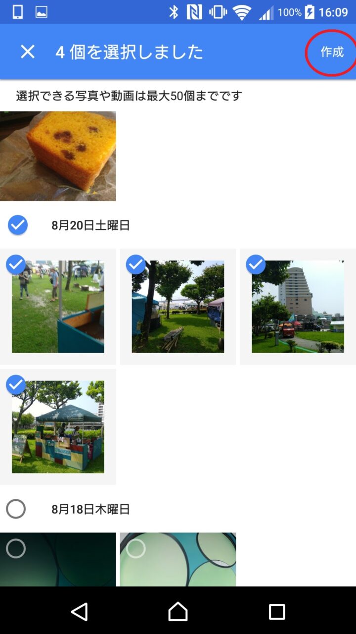 ショートムービー作成用の写真や動画を選択し、“作成” をタッチします。