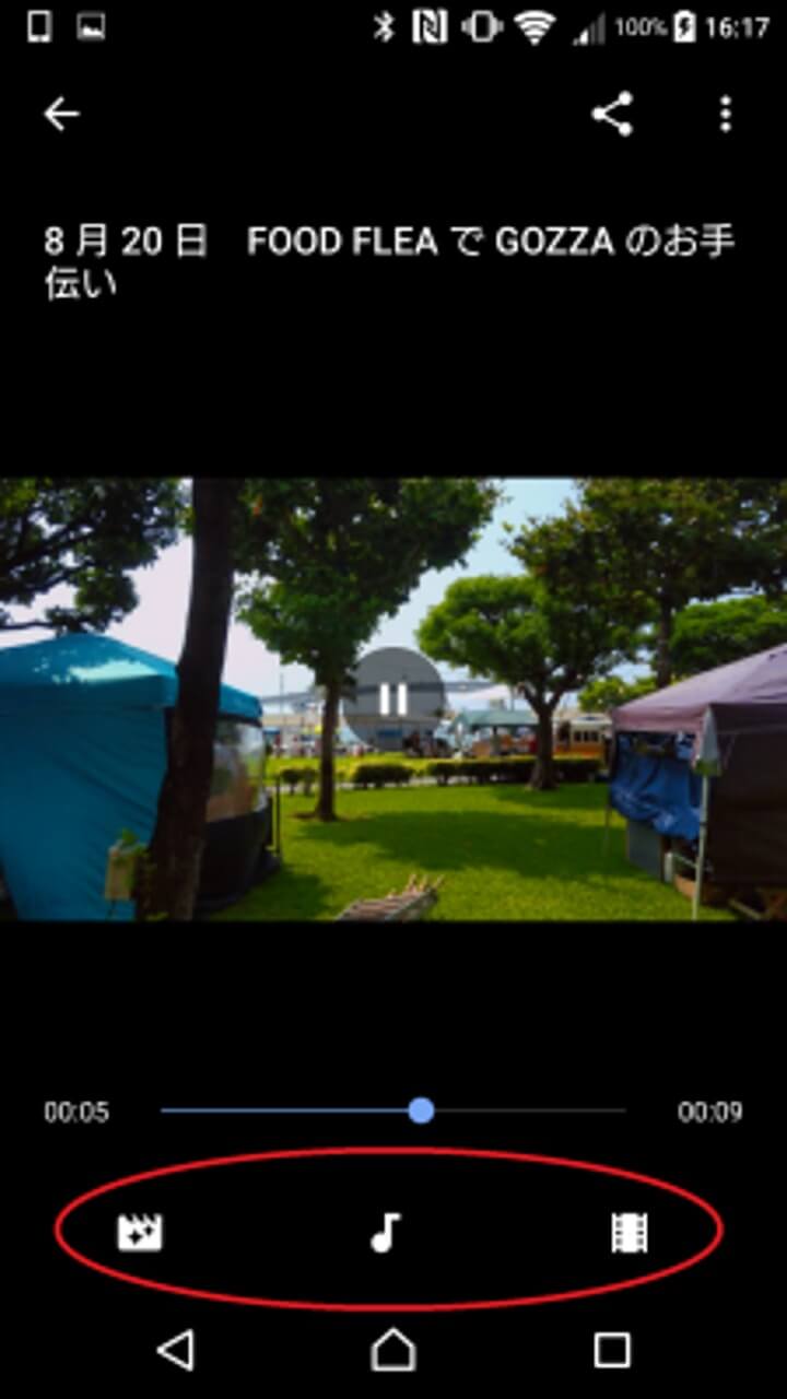アイコンは左から、“エフェクト” “音楽” “写真や動画の追加・削除” です。