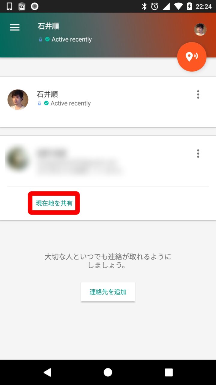 実際に自分の位置情報を共有する方法は、先ほど登録したユーザーをタッチして表示される “現在地を共有” をタッチするか、右上の位置情報共有アイコンをタッチして “共有相手を選択” か “今すぐ共有” をタッチして進みます。