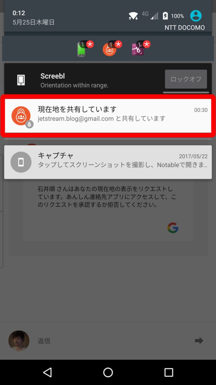 このほか、現在地を共有している間は自身の Android の通知バーに、現在地を共有している旨の通知が表示され続けます。ここをタッチして共有を解除することも可能です。