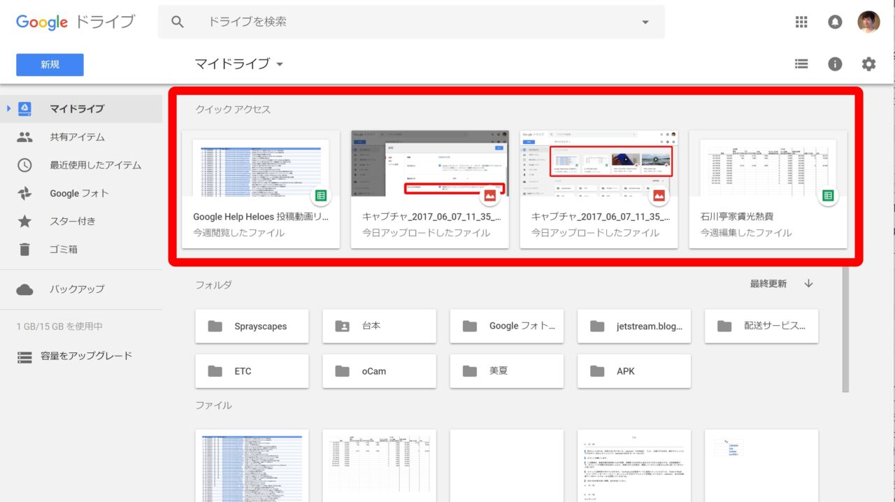 そして 2017 年 6 月より、デスクトップ版の「Google ドライブ」でも利用できるようになり、スマートフォン版アプリと同じように “クイック アクセス” を利用したファイルへのダイレクトアクセスが可能となりました。