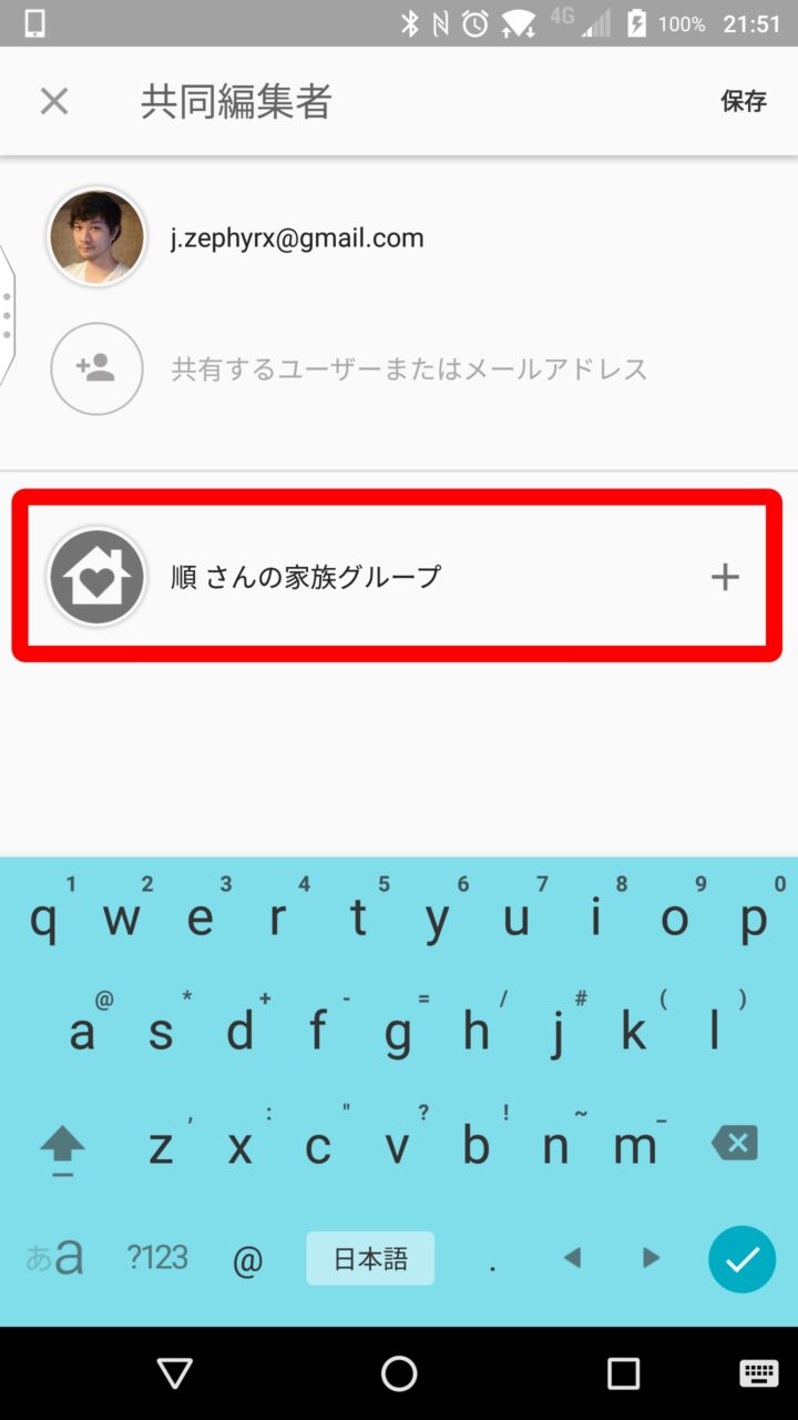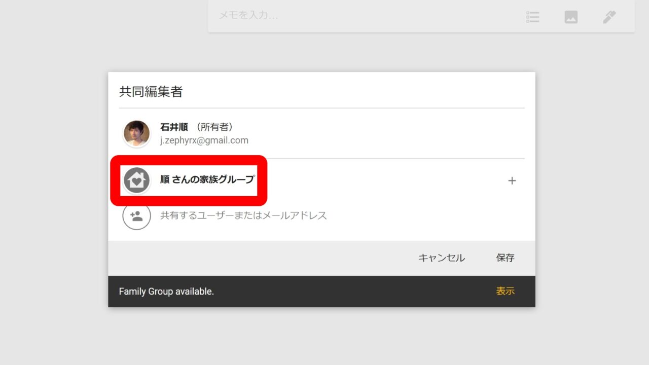 実際の共有は「Google Keep」のメモを表示して、“共同編集者” のアイコンから “家族グループ” を選択するだけです。