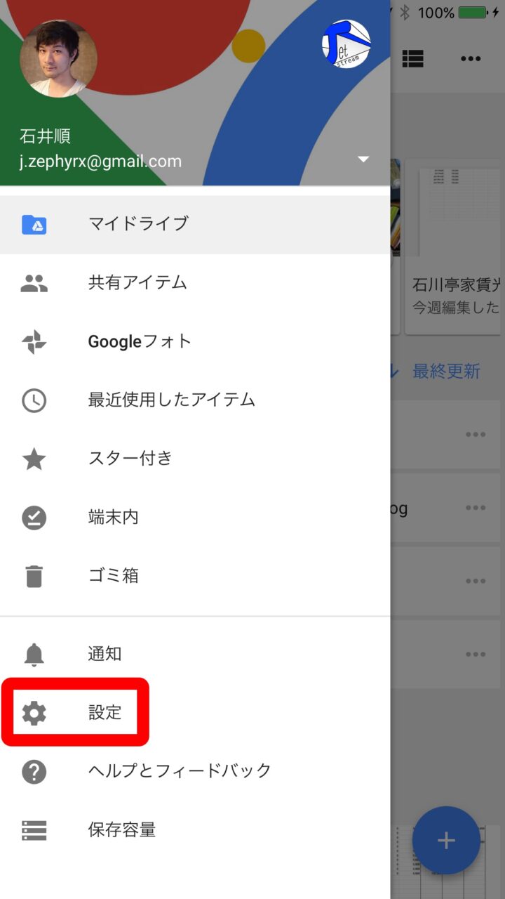 iOS 版「Google ドライブ」アプリに “パスコードロック” を設定する方法は、「Google ドライブ」アプリを起動して、左上のメニューアイコンをタッチし、“設定” をタッチします。