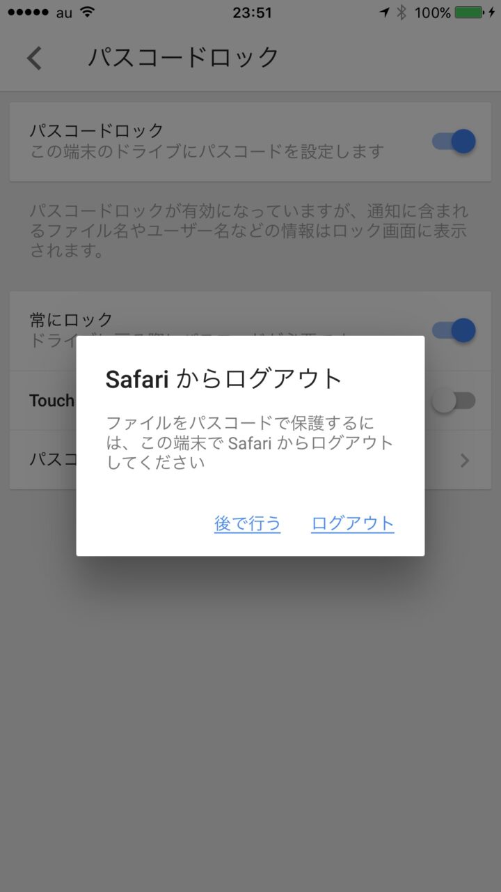 ただし “パスコードロック” を設定すると、一旦「Safari」でログインしている Google アカウントのログアウトが求められるので一旦ログアウトし、再度ログインします。