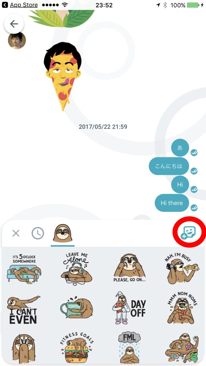 iPhone 版「Google Allo」でオリジナルステッカーを作成する方法は、Android 版の方法と同じです。まずチャット画面でステッカーアイコンをタッチし、メッセージ入力バーの右端に表示される “+” アイコンをタッチします。
