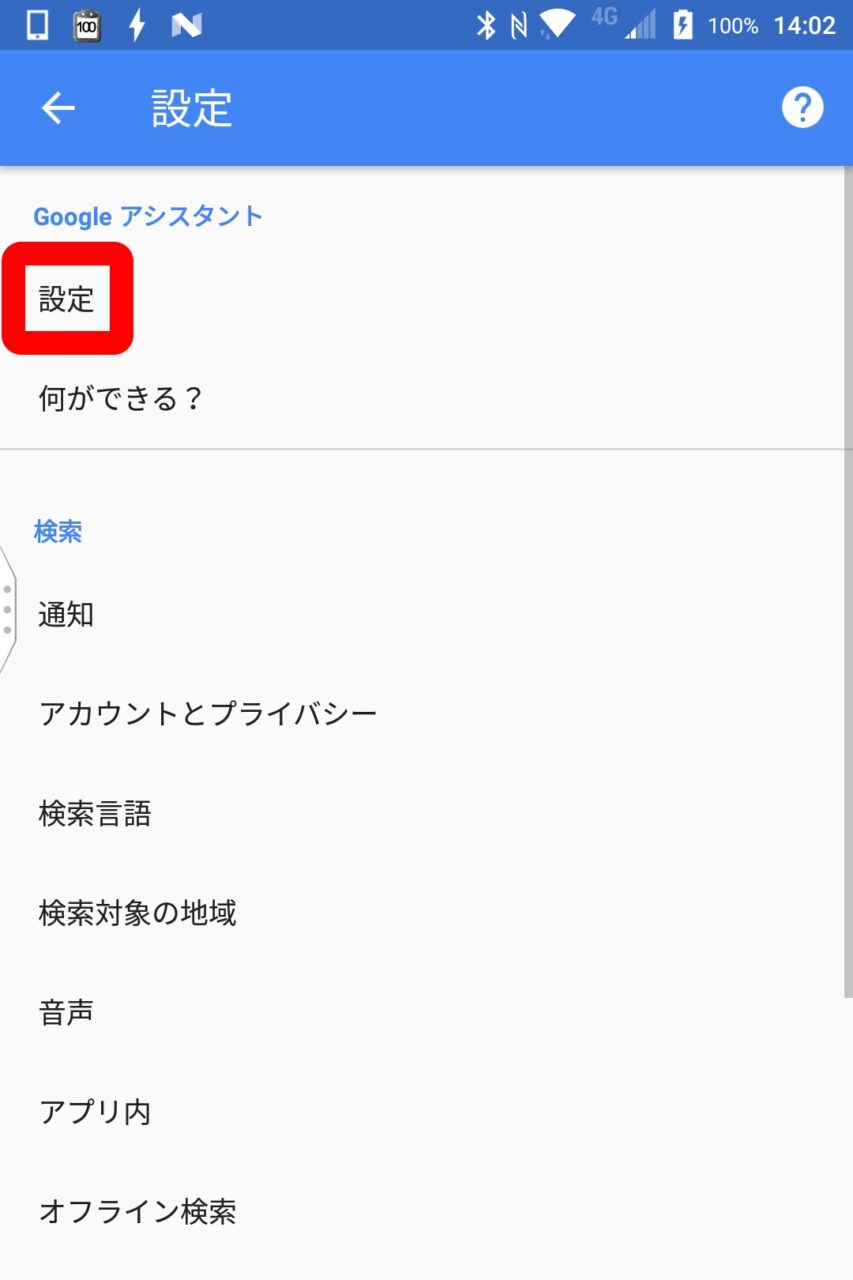 「Google アシスタント」に個人情報を設定する方法は、まず「Google」アプリを開いて左上のメニューアイコンから “設定” をタッチし、ページ上部の “Google アシスタント” カテゴリに表示される “設定” をタッチします。
