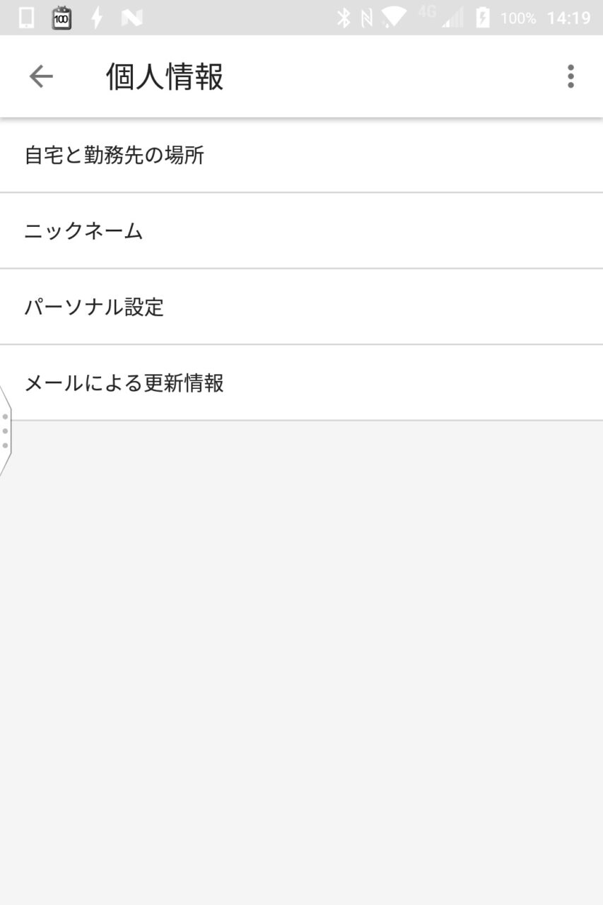 個人情報の設定項目は、“自宅と勤務先の場所” “ニックネーム” “パーソナル設定” “メールによる更新情報” の 4 つです。