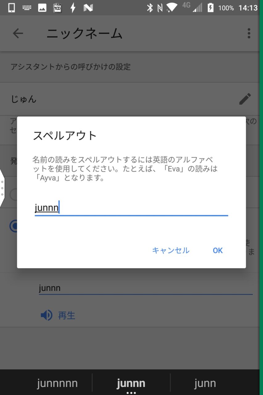 このときに単純な呼び名のスペルを入力するだけでも大丈夫ですが、語尾に母音などを足すことでより名前らしい呼び方に変わります。“再生” を押すことで実際の発音が再生されるので、ここで確認しつつ調整を行ってみてください。
