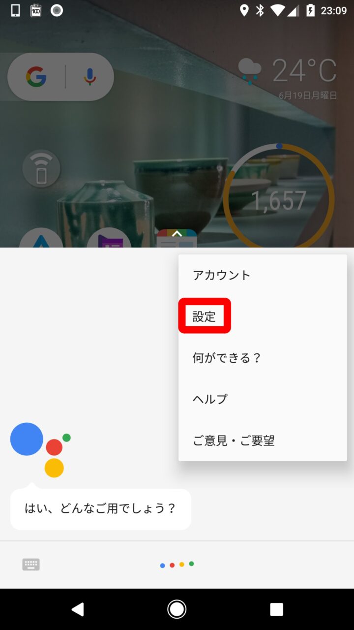 「Google アシスタント」の優先入力をキーボードに設定する方法は、「Google アシスタント」を起動して右上のメニューアイコンをタッチし、“設定” をタッチします。
