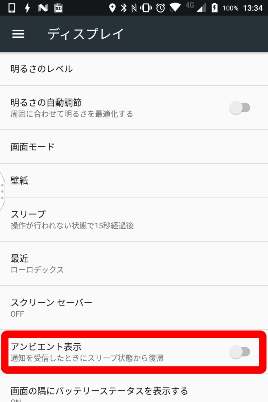 Android の “アンビエント表示” 機能は、設定を開いて “ディスプレイ” をタッチすることで機能の オン / オフ スイッチが表示されるので、オン にすることで利用することができるようになります。