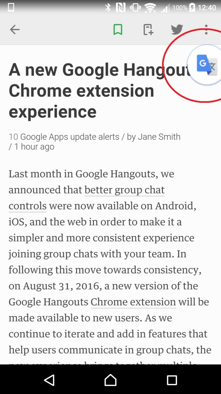 「タップして翻訳」は、2016 年 5 月 11 日に、Android 用の「Google 翻訳」アプリに追加された新機能で、アプリを問わずに翻訳したい外国語を素早く翻訳できる機能です。