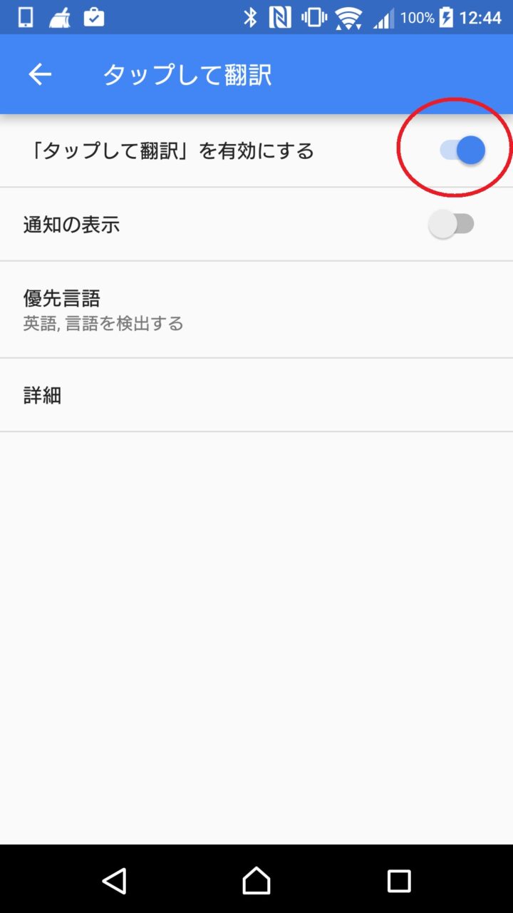 一番上の “タップして翻訳” をタッチして、“タップして翻訳を有効にする” を ON の状態にします。