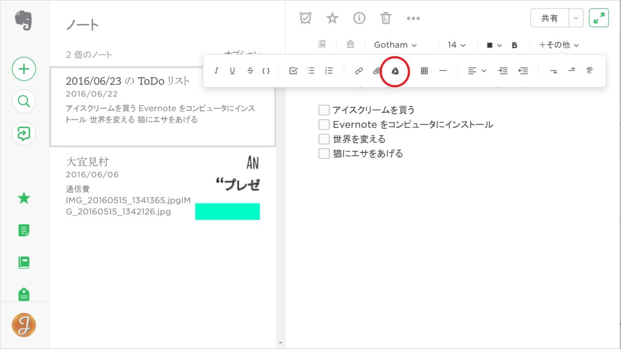 「Evernote」をベータ版に切り替えると、ノートの画面に「Google ドライブ」のアイコンが表示されるようになります。