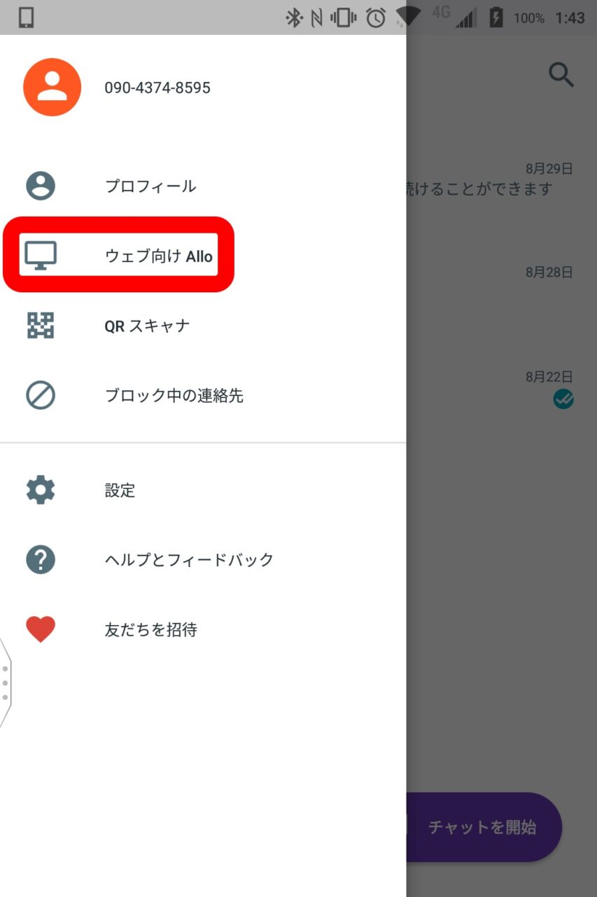 次にスマートフォン版「Google Allo」を起動し、左上のメニューアイコンから “ウェブ向け Allo” をタッチして、続いて “QR コードのスキャン” をタッチします。