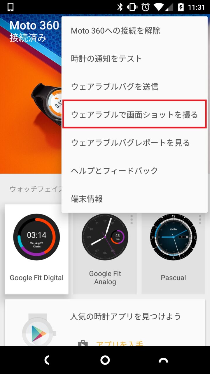 “ウェアラブルで画面ショットを撮る” をタッチすると、Android Wear の現在の画面表示が撮影されます。