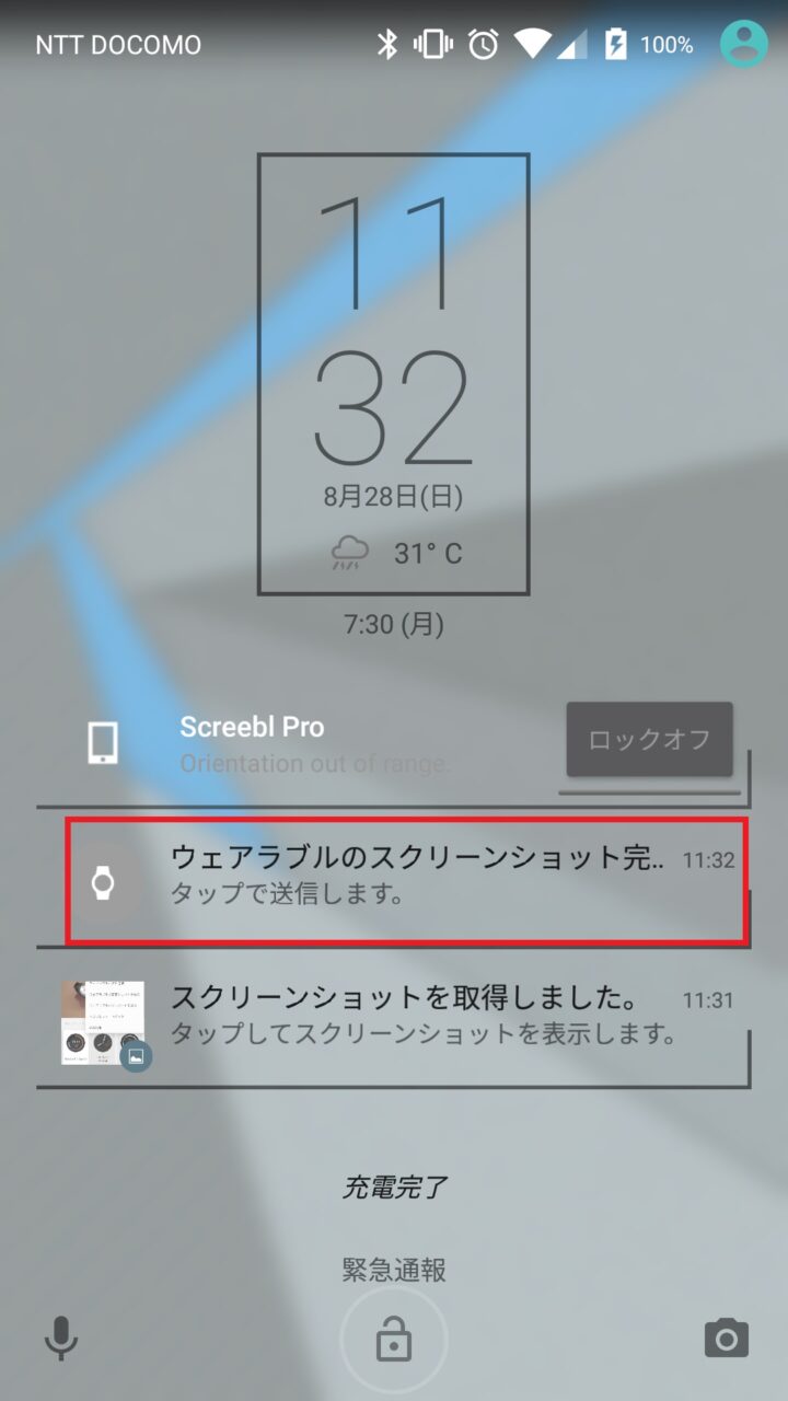 つまり、“ウェアラブルで画面ショットを撮る” をタッチする直前に、Android Wear で撮影したい画面を表示しておく必要があります。タイミングが重要です。