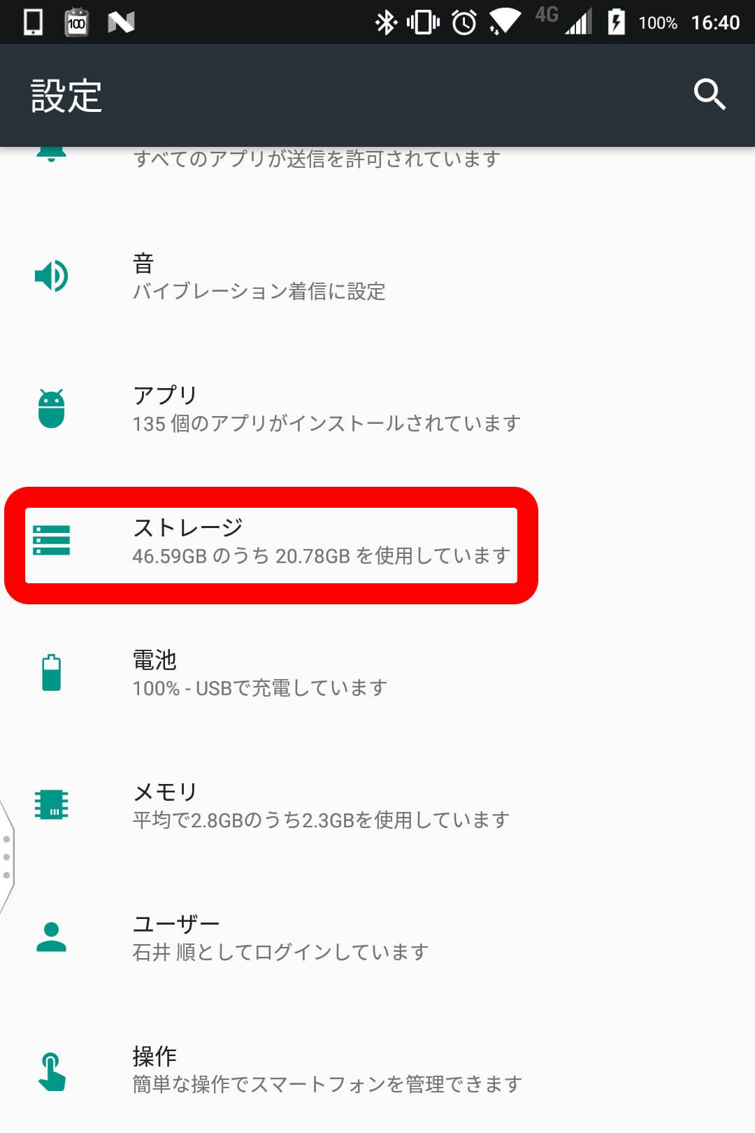 Android に micro SD カードなどのメモリーカードを挿している状態で Android の設定を開き、“ストレージ” などの項目をタッチします。