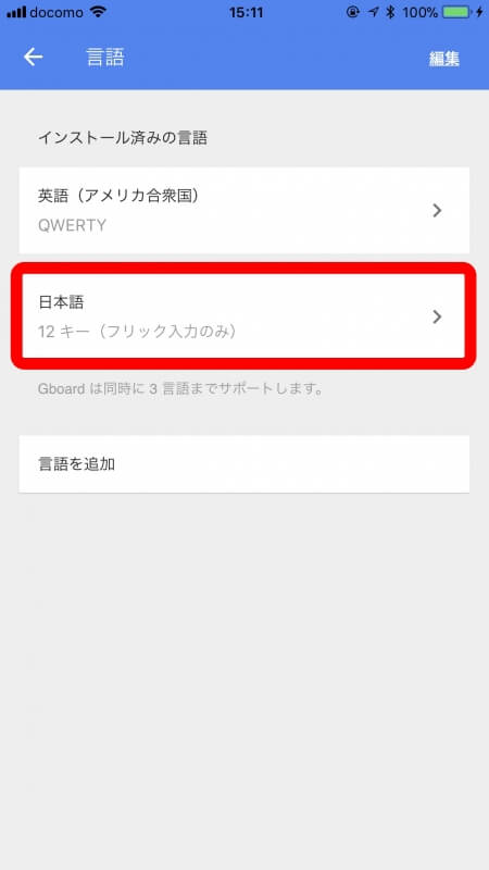 ちなみに「Gborad」は最大 3 つの言語までセットして切り替えつつ利用することができるので、英語なども同時に利用することで、iOS 機種で「Gborad」のみでの言語入力を行うことができるようになります。