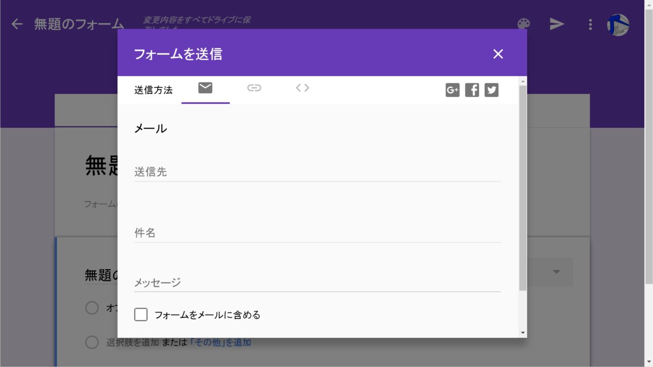 作成した「Google フォーム」は、メールで送信、URL リンクを取得、ホームページなどに埋め込み(インラインフレームタグ形式)が可能です。