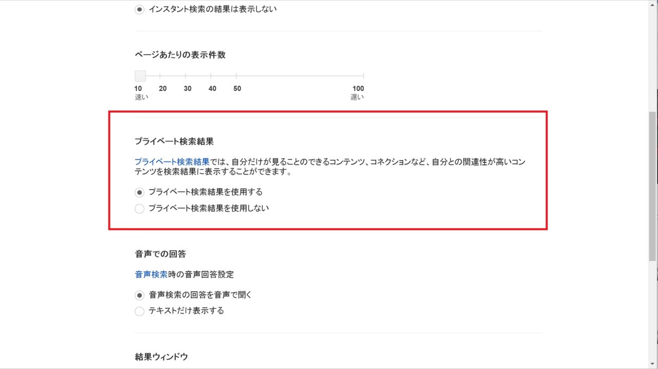 表示された項目から、その名の通り “プライベート検索結果” を探して設定します。