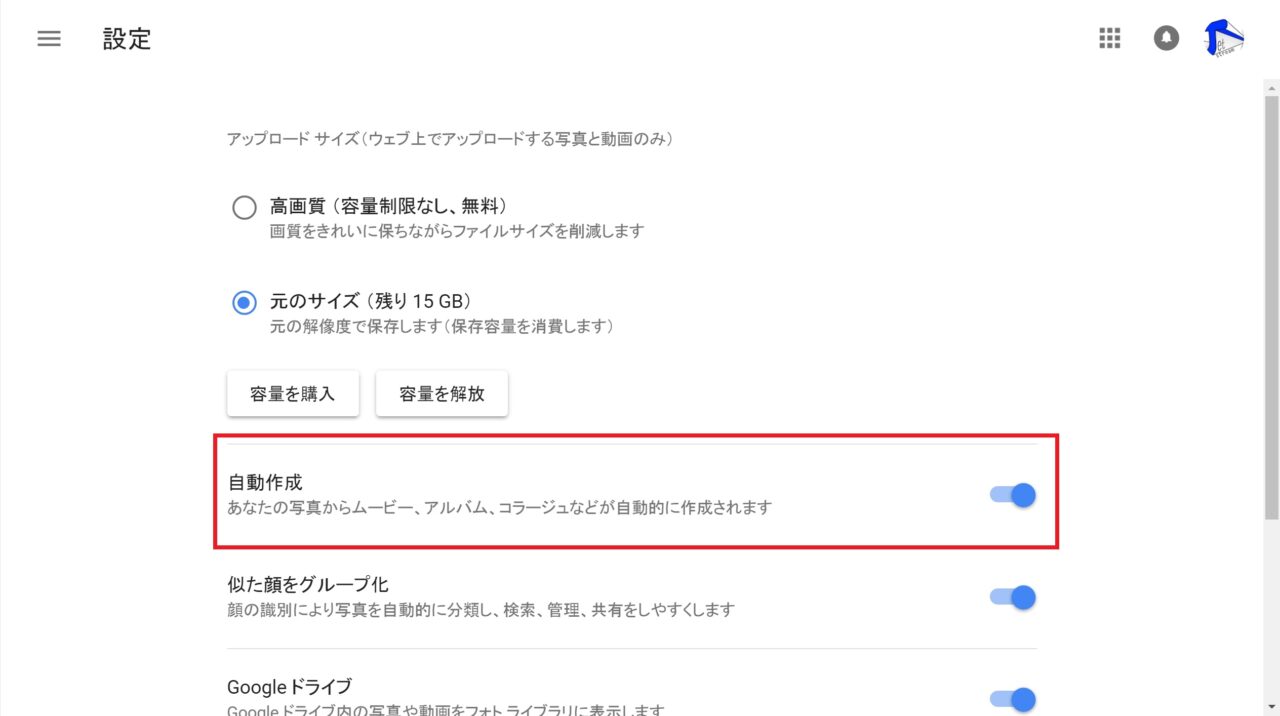 表示される設定項目の “自動作成” と “この日の思い出” のスイッチが “アシスタント” のそれぞれの設定項目となります。