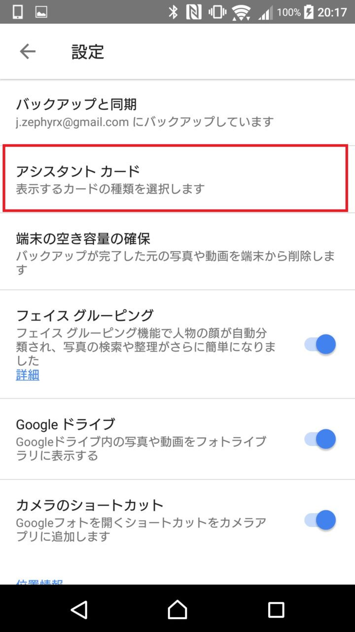 またスマートフォンアプリの場合は、同じくメニューアイコンから “設定” へと進み、更に “アシスタントカード” をタッチします。