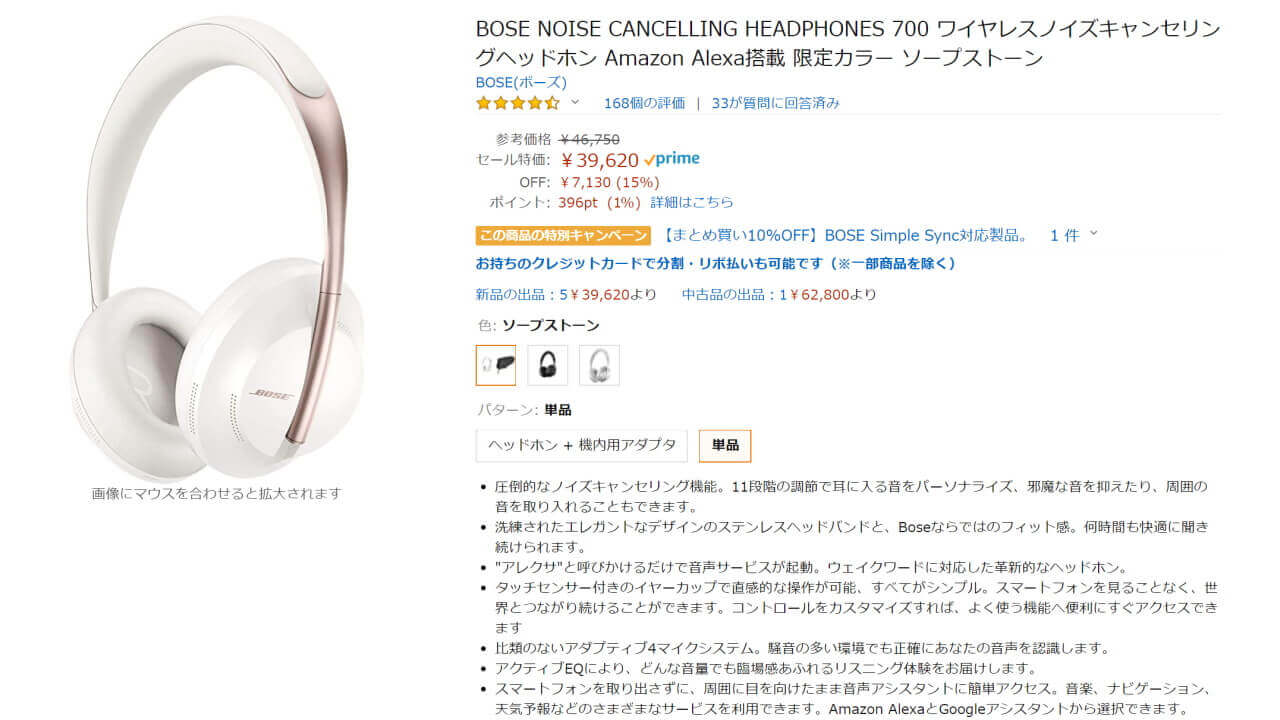 「Bose Noise Cancelling Headphones 700」の Amazon 価格は、元値 46,750 円。そこから 15%(7,130 円)引きが適用され、39,620 円で購入可能となっています。